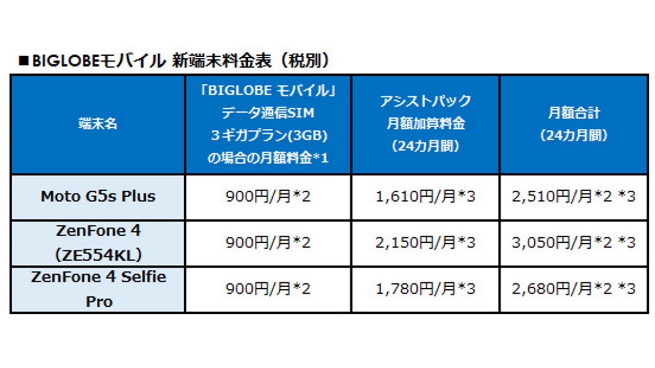 新機種は、Motorola 製 SIM フリースマートフォン「Moto G5S Plus」と ASUS 製「ZenFone 4(ZE554KL)」「ZenFone 4 Selfie Pro(ZD552KL)」です。