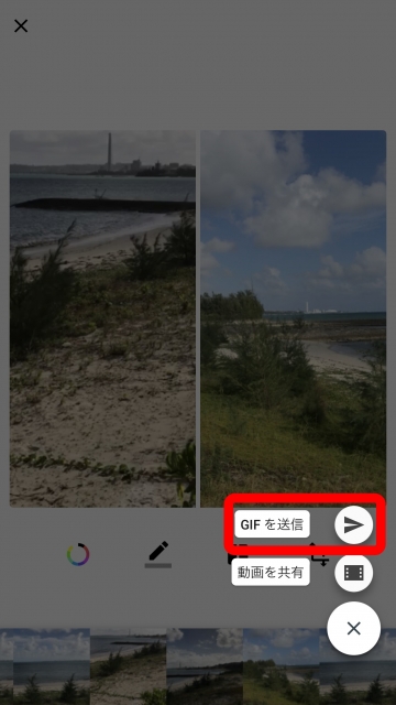 「コラージュ」で作成したファイルは前回の段階では MOV 形式のファイルとしてエクスポートすることしかできなかったのですが、v2.0 では GIF アニメーションとしてエクスポートできる “GIF を送信” が新たに追加されています。