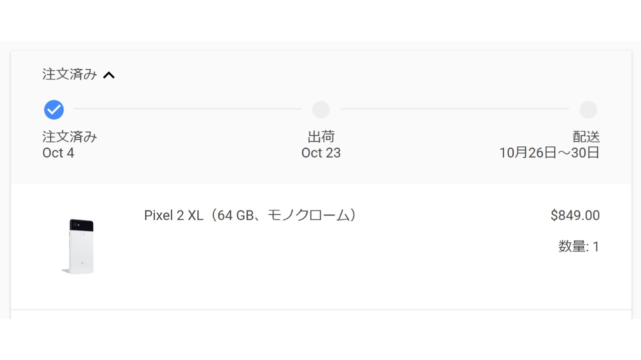 私も「Pixel 2 XL」64GB “Black and White” の通称 “パンダカラー” を発表時点で即効予約し、当初の発送予定となっていた 10 月 23 日を心待ちにしてその日を迎えたわけですが、、、予定通り発送とはなりませんでした。現地時間で 10 月 24 日を迎えたわけですが、特に遅延連絡などもなく、まだ出荷は行われていません。