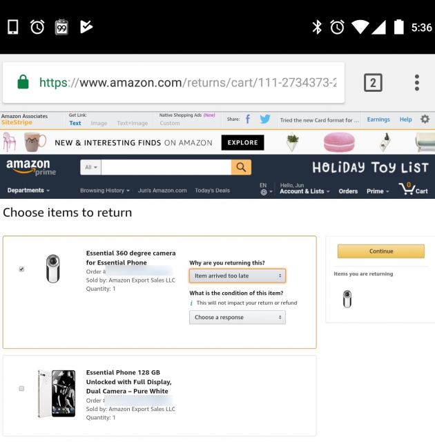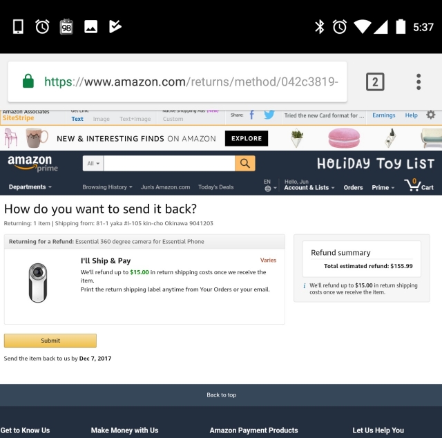 ただどうやら出荷後即返品処理をしても、結局商品自体の配送は止められない模様で、まずは手元に商品が到着してしまいそうです。そのため「360 Camera」が手元に届き次第、返品処理を行おうと思っています。