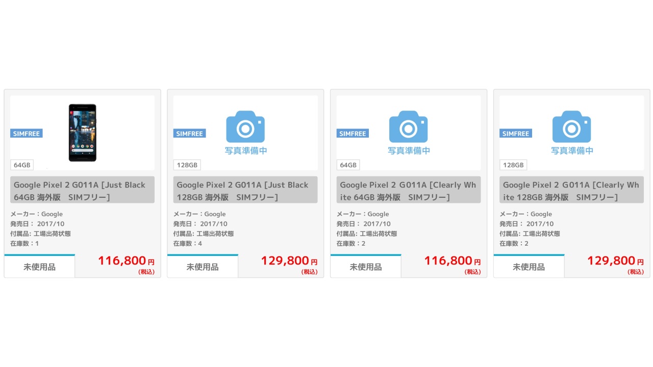 ようやく「Pixel 2」を、国内で購入することができます。イオシスには現在、「Pixel 2」の “ブラック(Just Black)” と “ホワイト(Clearly White)” の 64GB と 128GB モデルが入荷しています。計 4 モデルです。