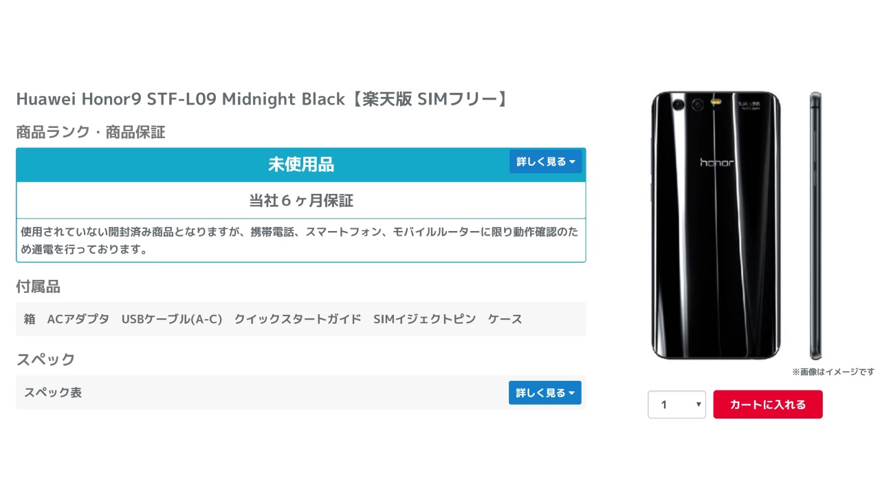 「Honor 9」“ミッドナイトブラック” は、「楽天モバイル」で販売されている限定カラーです。基本的には、「楽天モバイル」の MVNO SIM 契約と同時に購入する必要があります。