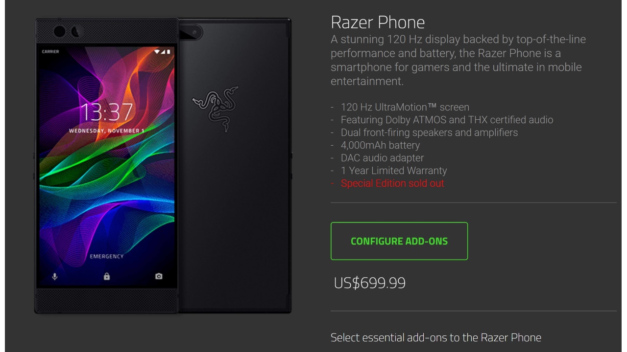 ただし、日本時間 11 月 15 日 13 時半時点で「Razer Phone Special Edition」は “Sold-Out” となっています。「Razer Phone」自体発売されたばかりなので、「Razer Phone Special Edition」は瞬殺となったのかもしれないですね。