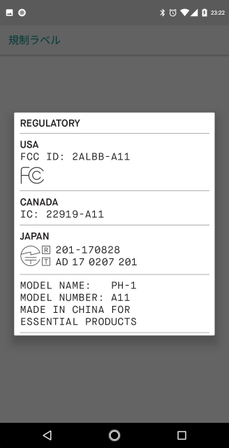 これまでは米国(FCC)とカナダの 2 カ国の規制ラベルだったので、日本の技適マークも加わって 3 カ国の規制ラベルが表示されるようになりました。技適マークが表示されるようになったからといって「Essential Phone」が日本で発売されるとは限りませんが、少なくとも国内利用は問題なくなりました。