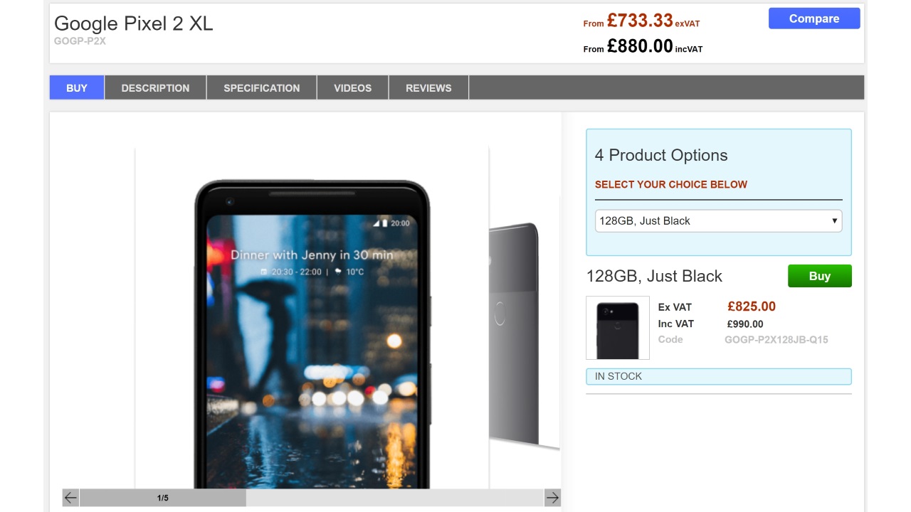「Pixel 2 XL」は “ブラック(Just Black)” と “ブラック & ホワイト(Black & White)” の 2 色展開ですが、Clove にはまず “ブラック” の 64GB と 128GB の両モデルが入荷しています。価格は 64GB が VAT 抜き £733.33(約 109,000 円)、128GB が £825.00(約 12,2500 円)です。
