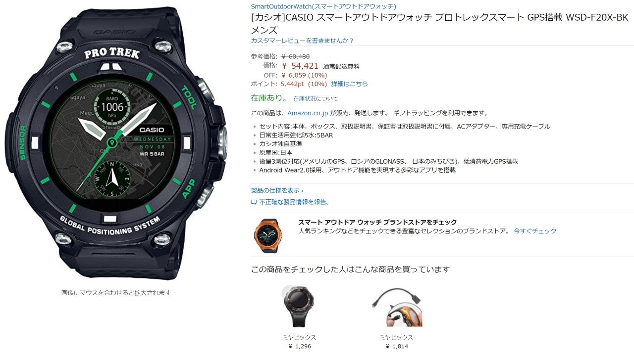 「PRO TREK Smart(WSD-F20X)」の公式価格は 56,000 円(税抜き)で、カシオ公式のほか、Amazon などでも発売しています。ちなみに、Amazon は10% 引き + 10% ポイント還元となっているのでかなりお得です。