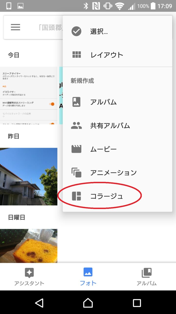 「Google フォト」アプリの “コラージュ” を利用する方法は、「Google フォト」アプリを起動して、右上のメニューアイコンをタッチし、表示されるメニューから “コラージュ” をタッチします。