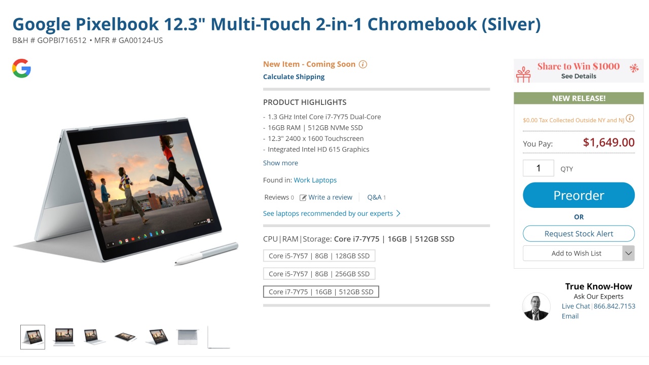 B&H における「PixelBook」最上モデルの本体価格は $1,649.00 と、Google 公式と同じです。ただし入荷時期などは明記されていないので、入荷未定での予約となります。また現時点では、日本直送も未対応となっています。
