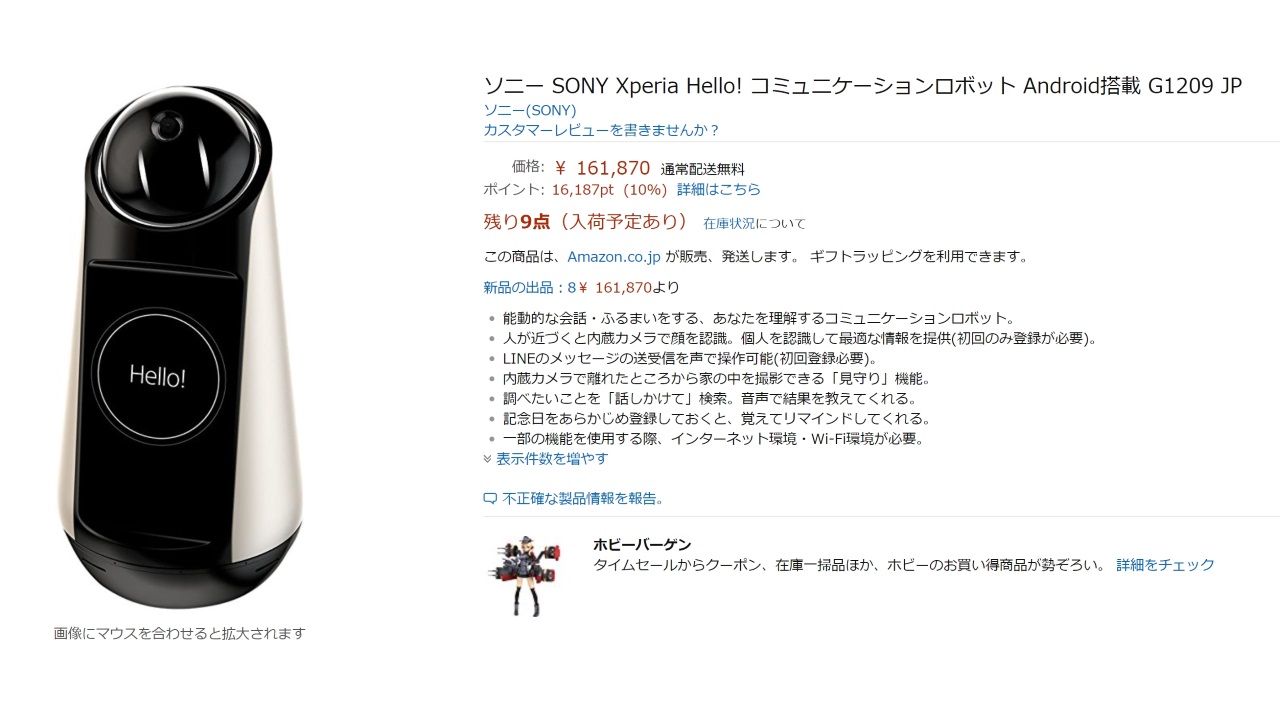 [amazonjs asin=”B076D97WW2″ locale=”JP” title=”ソニー Sony Xperia Hello! コミュニケーションロボット Android搭載 G1209 JP”]