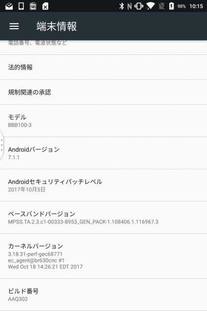 ただ、今回のソフトウェアアップデートはセキュリティアップデートではない模様で、アップデートを行っても Android セキュリティパッチは 2017 年 10 月 5 日のままでした。ビルド番号は「AAQ302」に更新されていますが、何が変わったのかはよくわかりません。