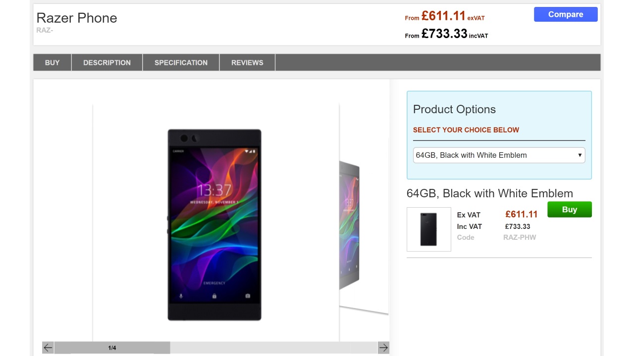 Clove における「Razer Phone」の本体価格は、VAT 抜き£611.11(約 90,650 円)です。米国公式価格 $699.99(約 78,450 円)より高め。
