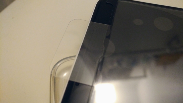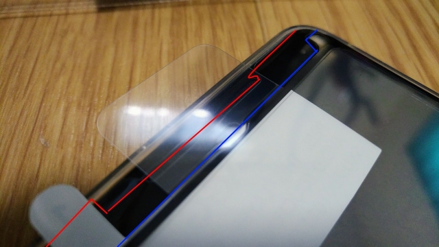 いきなり貼らずに、まずはシールドを貼った間ままスマートフォンにあてがいます。実際に貼る位置の確認も兼ねつつ、ノーブランドのガラスフィルムとのサイズの違いを確認するための、ノーブランドのガラスフィルムを貼ったままの状態であてがいました。