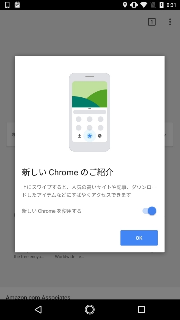 今回確認したのは、つい先日新規で購入した「Android One X1」にインストールした「Chrome Beta」です。アプリバージョン v63.0.03239.60 で、アプリを起動したところ “新しい Chrome” への切り替えを促すメニューとスイッチが表示されました。UI は以前ご報告させていただいた内容と、特に変わりはありません。