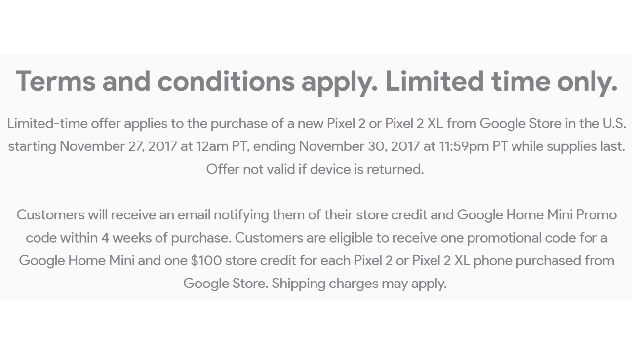 Customers will receive an email notifying them of their store credit and Google Home Mini Promo code within 4 weeks of purchase. Customers are eligible to receive one promotional code for a Google Home Mini and one $100 store credit for each Pixel 2 or Pixel 2 XL phone purchased from Google Store. Shipping charges may apply.