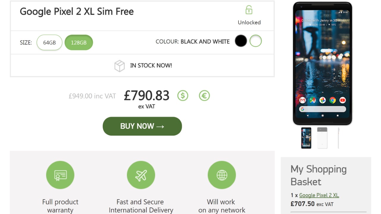 「Pixel 2 XL」は “ブラック(Just Black)” と “ブラック & ホワイト(Black & White)” の 2 色展開で、64GB と 128GB の計 4 モデルがありますが、Unlocked Mobiles には一気に全モデルが入荷しています。価格は、64GB が VAT 抜き £707.50(約 106,150円)、128GB が £790.83(約 118,650 円)です。