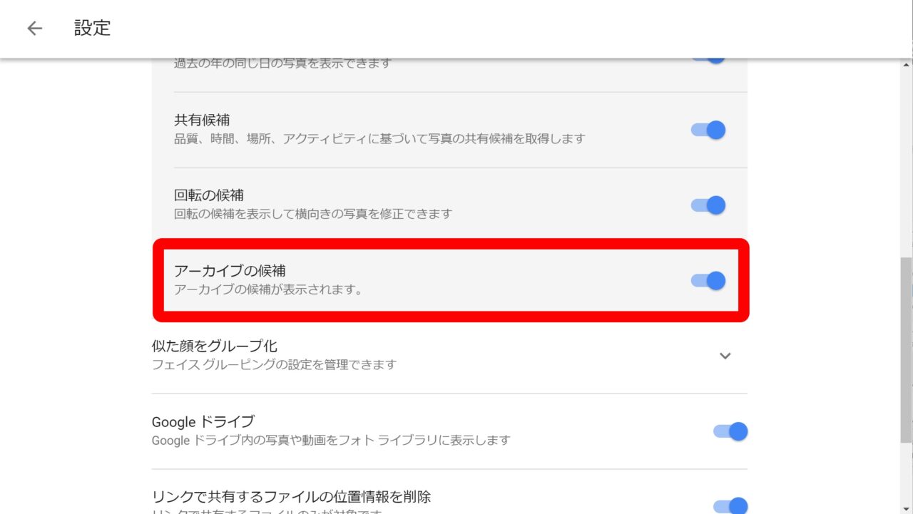 この設定を オン にしておくと、ユーザーが手動で写真を “アーカイブ” にする行為を「Google フォト」が学習し、以降に “アーカイブ” にする写真の候補を自動で表示してくれるようになります。