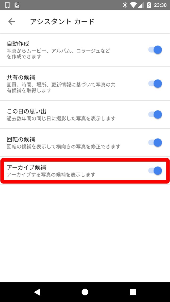 「Google フォト」のアシスタントに追加された “アーカイブ” の設定は、自動で “アーカイブ” の候補写真を表示してくれる “アーカイブの候補” です。