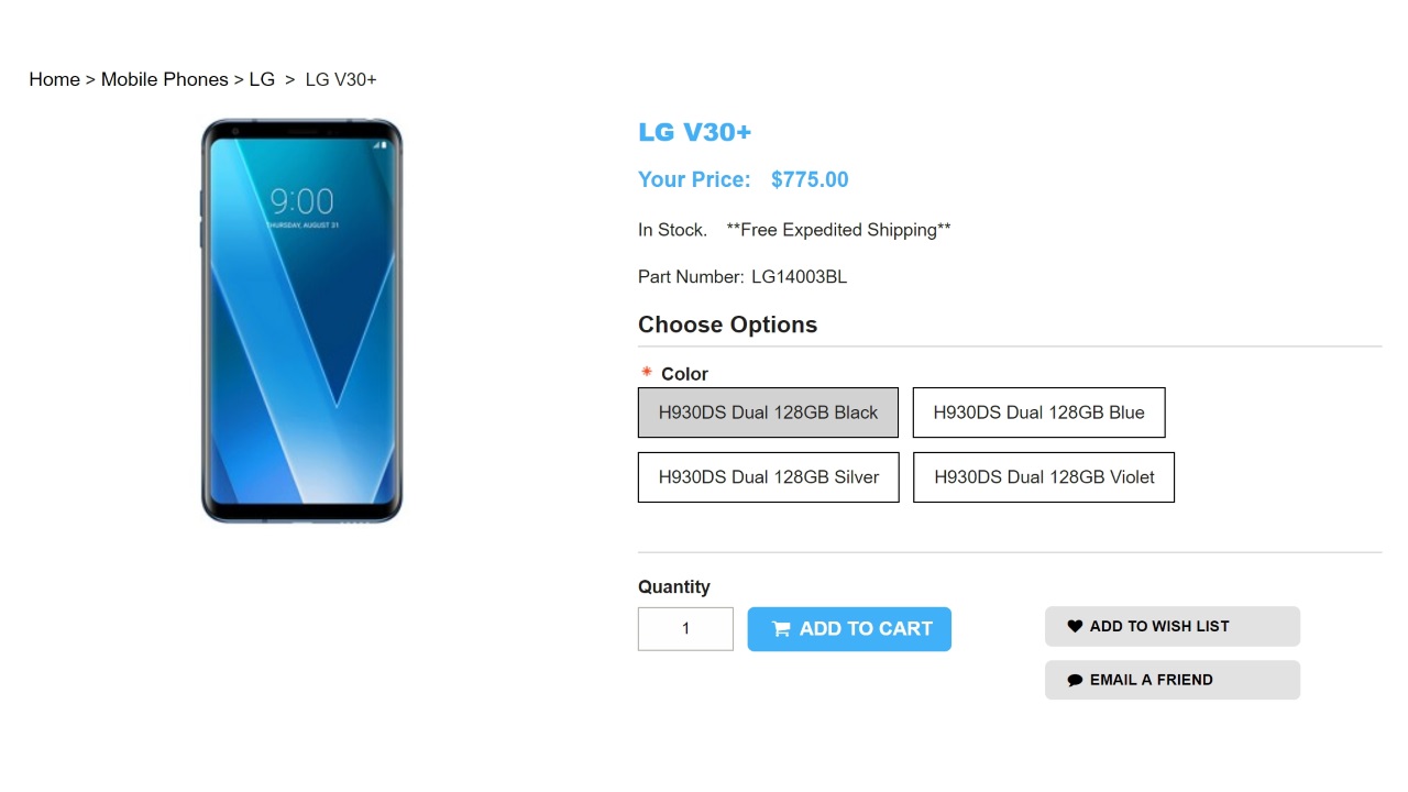 1ShopMobile からLG V30+(H930DS)を $$775.00 で直輸入する場合の概算総額は、以下の通り。