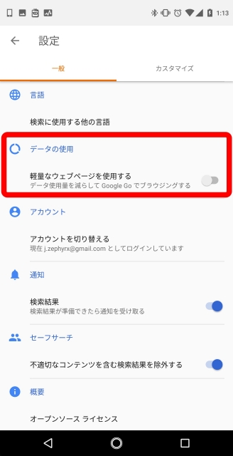 また「Google Go」にはデータ使用量を減らずことができる軽量ブラウジング機能 “データの使用” 項目も実装されていて、スイッチを ON にすることで、WEB ページが圧縮して表示されるようにもなります。AMP と似ていますが、URL や構造的にはことなる模様です。