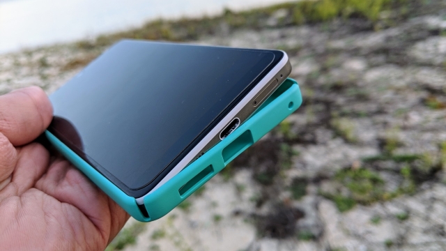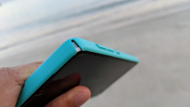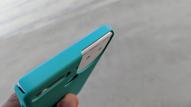 背面の指紋センサー部分ももちろん開いているのですが、ただ丸く開いているわけではなく、下に向かって斜めに削られているので、タッチはもちろんスライド操作も考慮された仕様でした。ハードケースということで TPU ケースに比べてケース自体に厚みはあるものの、このお陰で指紋センサー部分へのアクセスも容易です。