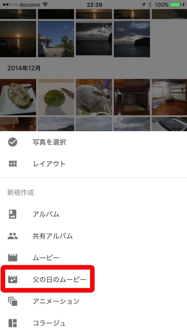 スマートフォン版「Google フォト」アプリで “父の日のムービー” を作成する方法は、母の日のムービーと同じです。「Google フォト」アプリを起動して右上のメニューアイコンをタッチし、表示されるメニューから “父の日のムービー” をタッチします。
