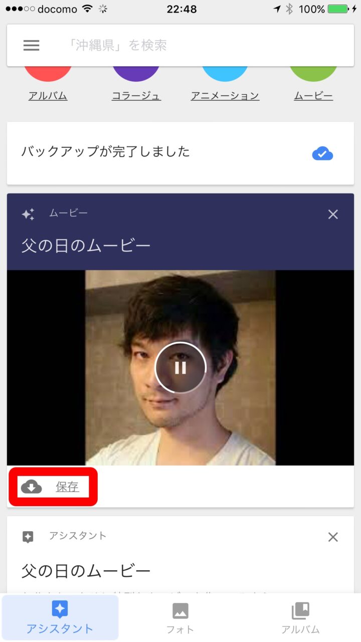 “父の日のムービー” の作成が完了すると「Google フォト」のアシスタントタブに “父の日のムービー” として表示されます。“保存” をタッチして「Google フォト」に保存することで、“父の日のムービー” をダウンロードすることが可能となります。