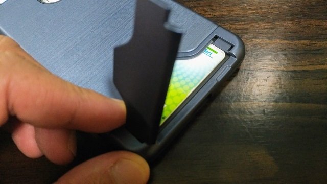 カードスロットは本体背面下部にあり、キックスタンドとも思える蓋部分を開けることで、カードを収納することが可能となります。そして、カードスロットはクレジットカード 1 枚をキッチリ収納できる程度のサイズです。