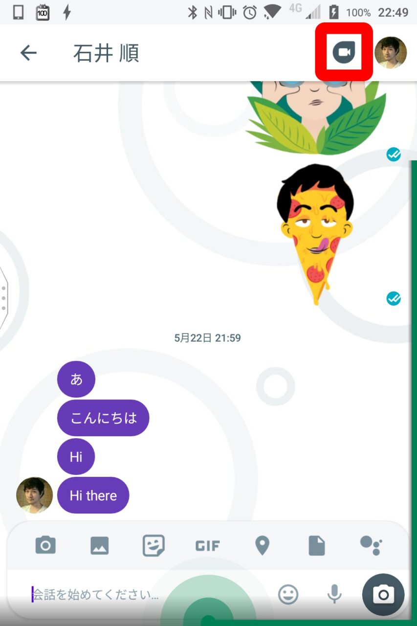 「Google Duo」ボタンはチャット画面右上のユーザーアイコン左横に表示されます。