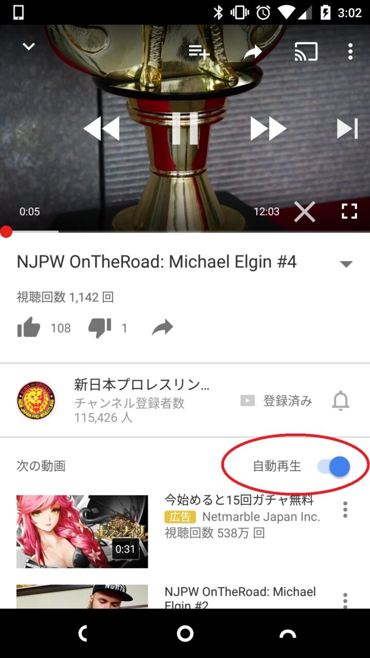 この “自動再生” 機能を ON にしておくと、現在再生している動画と関連のある動画が、次に自動で再生されます。