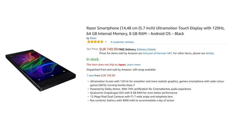 現在 “In-Stock” となっていて、商品ページ上は日本直送非対応表記ですが、日本直送可能です。Amazon での「Razer Phone」の本体価格は、以前と変わらず VAT 込 €749.99 となっています。