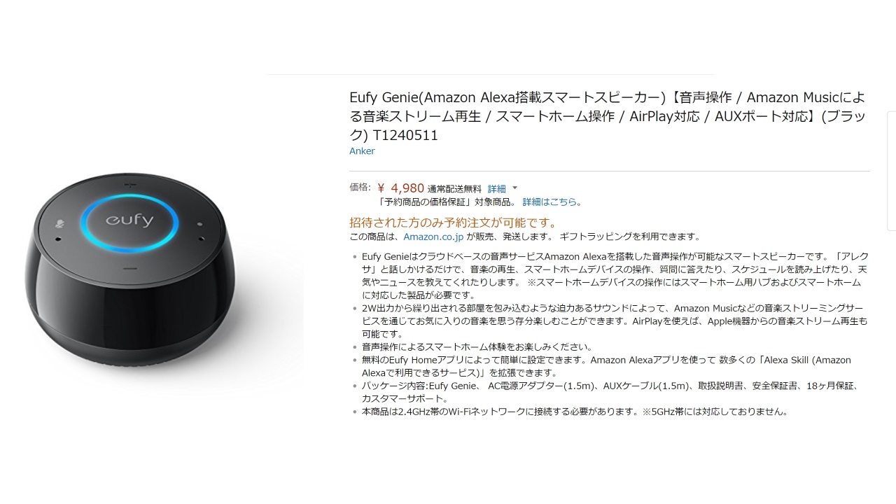 「Eufy Genie」は「Echo シリーズ」と同じく招待制で、Amazon の商品ページから招待をリクエストし、それが承認されることで購入できるようになります。「Eufy Genie」の国内価格は、4,980 円です。