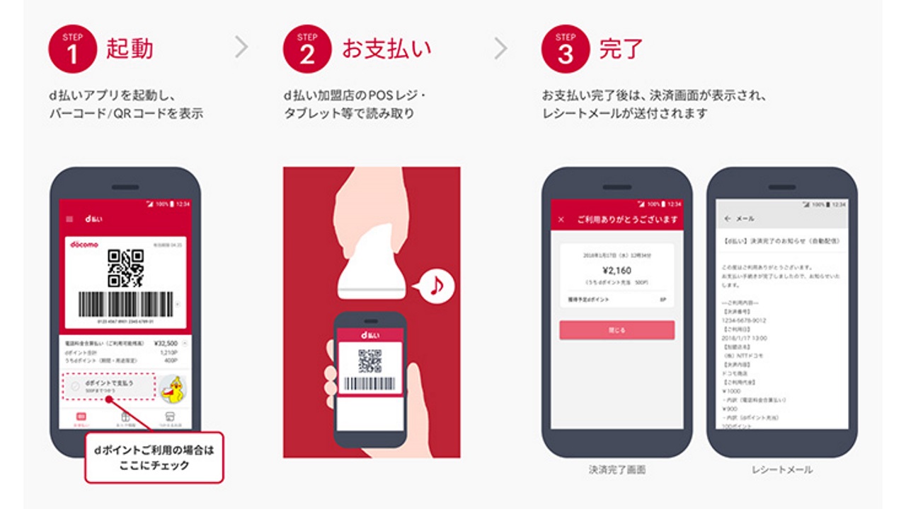 このほか「d 払い」では、最大で 100 円につき 1 ポイントの「d ポイント」も貯まります。