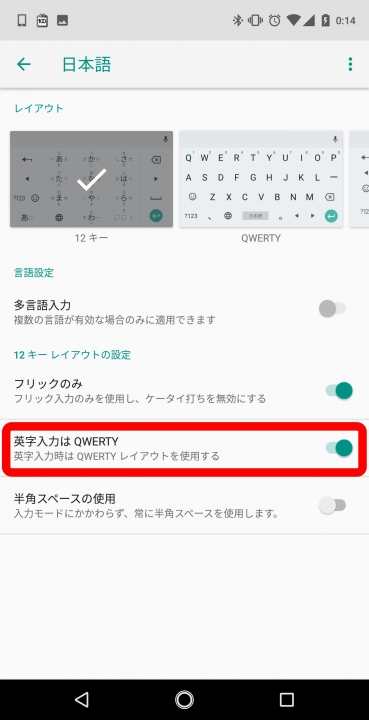 しかし新たにテンキー方式の日本語キーボード利用時でもアルファベット入力時の QWERTY キーボード設定が追加され、「Google 日本語入力」と同じ仕様で文字入力と切替を行うことができるようになりました。アルファベット入力時の QWERTY キーボード設定は、「Gboard」の日本語キーボード設定内に “英字入力は QWERTY” というスイッチを ON にするだけです。