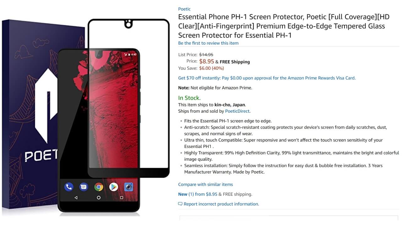以前当ブログでご紹介させていただいた、米国・サンフランシスコのスマートフォンアクセサリーメーカー Poetic Cases 製の「Essential Phone(PH-1)」用ガラスフィルム「SCREEN PROTECTOR」が、早くも米国の Amazon.com に入荷した模様です。