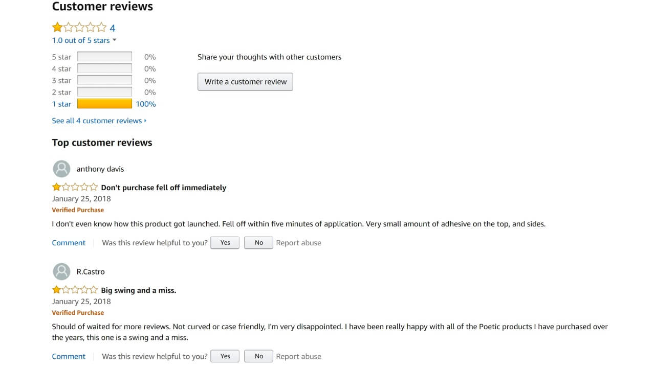 当ブログでも何度かご紹介させていただいた、米国・サンフランシスコのスマートフォンアクセサリーメーカー Poetic Cases 製の「Essential Phone(PH-1)」用ガラスフィルム「SCREEN PROTECTOR」ですが、現在販売が行われている現地の Amazon.com における評価が最悪です。