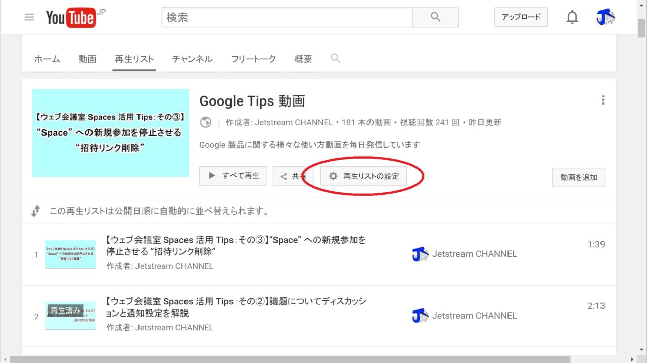 “再生リスト” に自動で動画が追加されるように設定する方法は、自動で動画を追加する、自身が作成した “再生リスト” をクリックして、“再生リストの設定” をクリックします。