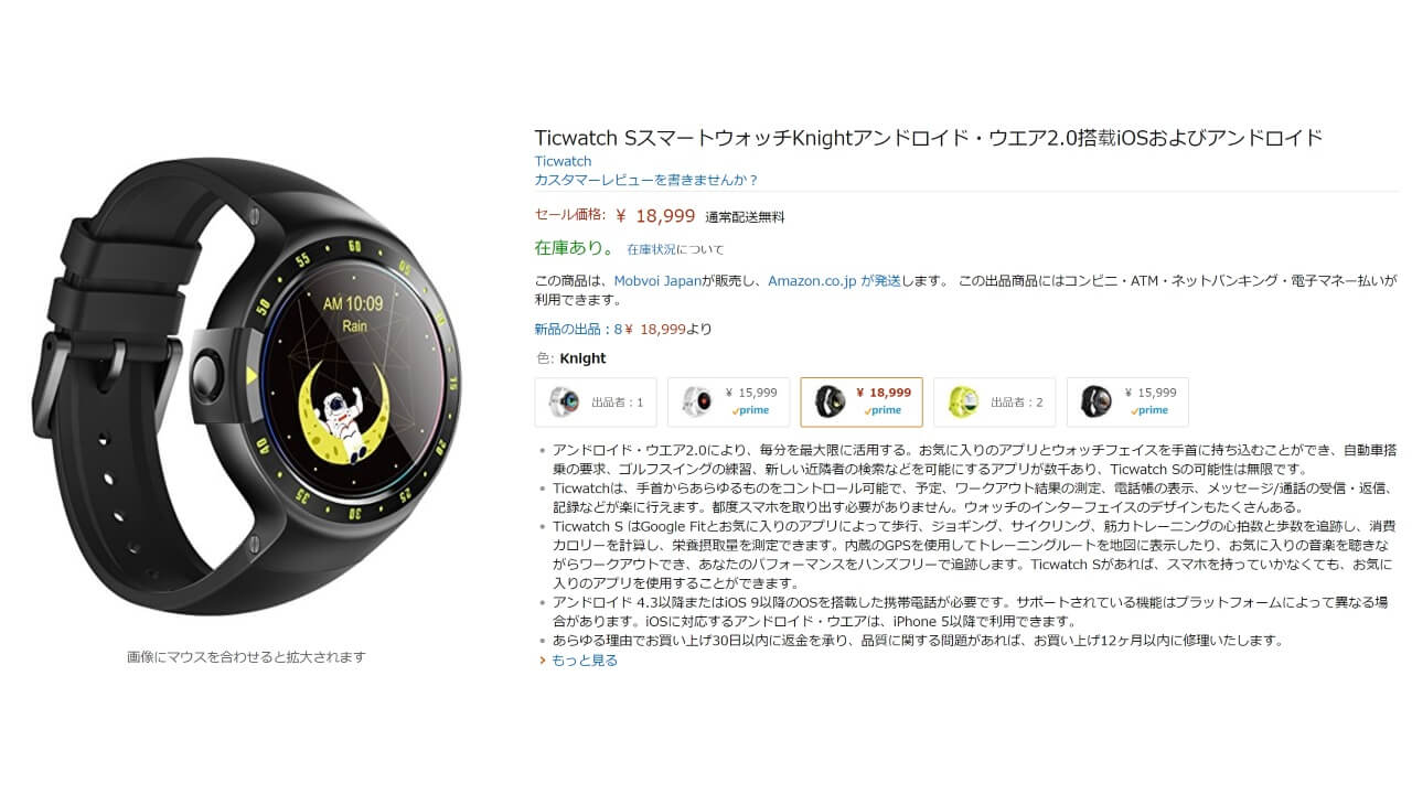 ちなみに Ticwatch による国内販売価格は、「Ticwatch S」が 18,999 円、「Ticwatch E」が 15,999 円とかなりリーズナブルです。