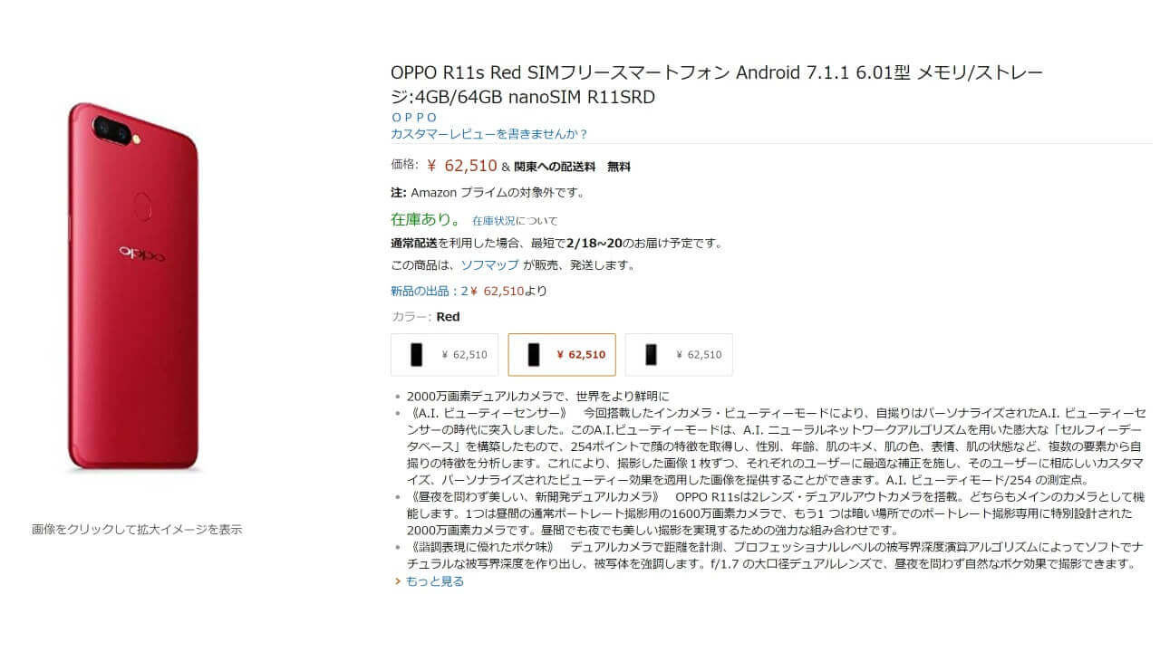 2018 年 2 月 9 日より発売された OPPO の国内第 1 弾スマートフォン「R11s」ですが、当初ヨドバシカメラとビックカメラのみを通しての発売となっていたところ、Amazon からも購入できるようになっていました。