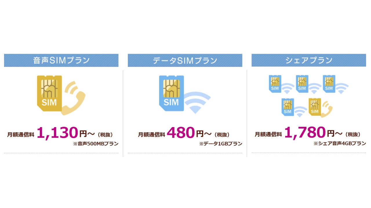 また各プランにおける料金も既存プランと同じで、データ通信 SIM は 480 円 ~、音声通話 SIM は 1,130 円 ~利用することができます。このほか、「イオンモバイル」の音声通話回線を複数の SIM でシェアできる「シェア音声 SIM」も対応です。