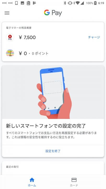 日本国内では相変わらず「楽天 Edy」と「nanaco」の 2 つの電子マネー決済を登録して利用することができ、またポイントプログラムも以前と同じく利用することができます。変わった点は基本的には UI のみで “ホーム” と “カード” の 2 つのタブに分かれ、“ホーム” では電子マネー残高と購入履歴の確認を行うことができ、“カード” では「Android Pay」のホーム画面と同じようなカード一覧を確認することができるページが表示されます。