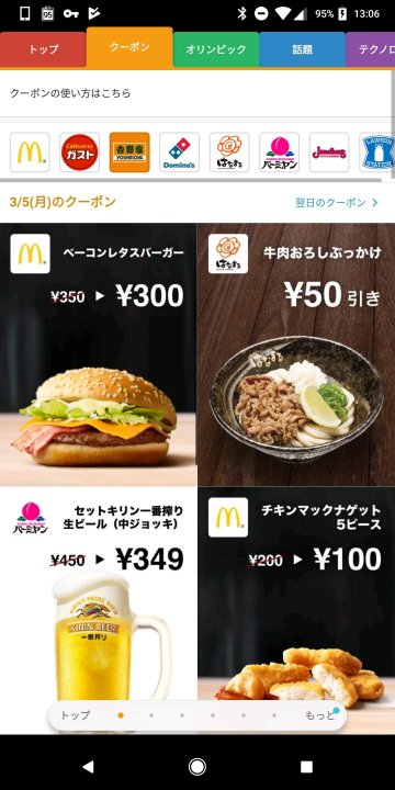 この「クーポン」チャンネルでは、マクドナルド、吉野家、ガスト、バーミヤン、ドミノピザなどで無料で利用できるお得なクーポンが毎日配信されます。