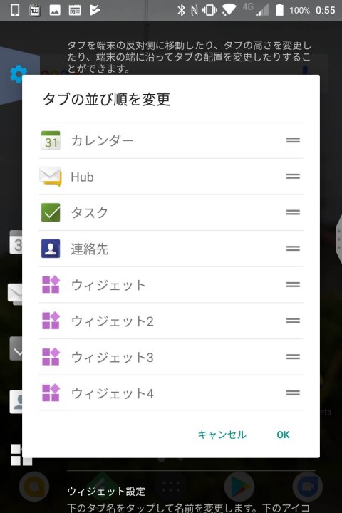 「BlackBerry 生産性タブ」のウィジェットは、ウィジェットタブ内に配置する仕様です。ウィジェットタブはデフォルトではタブアイコンの一番下に配置されていますが、こちらはタブの並べ替え設定から上位に移動させることも可能。またウィジェットタブが不要な場合は、非表示にすることもできます。