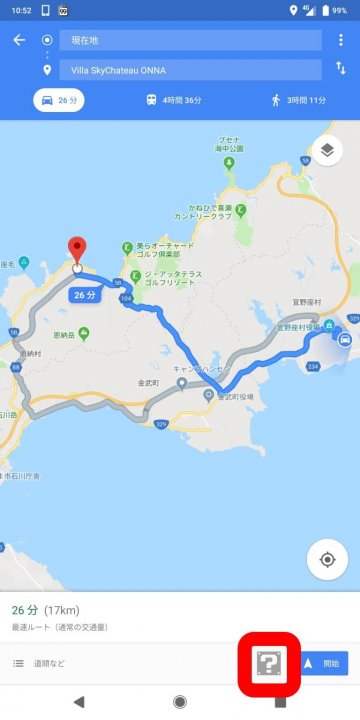 通常通り行きたいスポットや “経路” などから行き先を決めてナビ開始直前の画面を表示すると、画面下の “開始” の左横に “?” アイコンが出現します。それをタッチすると、マリオのカードが出現します。