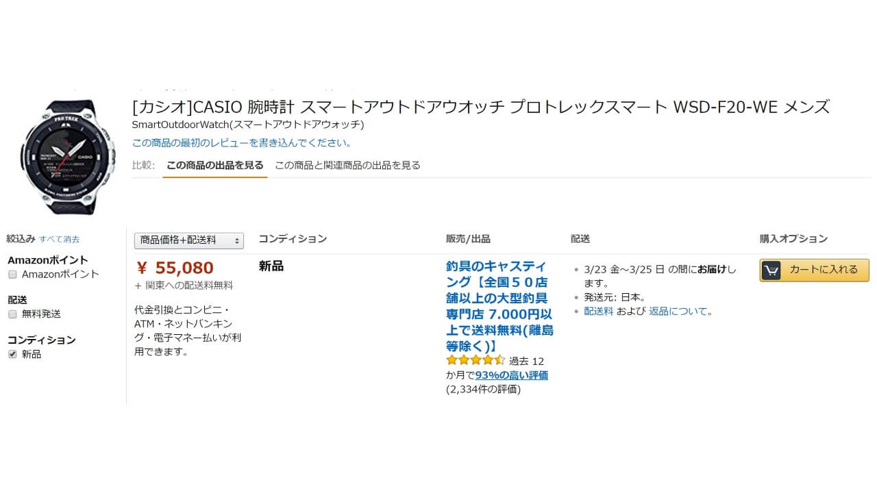 「PRO TREK Smart(WSD-F20-WE)」は世界 1,500 本限定で、価格は既存モデルと同じ 51,000 円(税抜き)です。Amazon ではマーケットプレイスの “釣具キャスティング” が出品していますが、消費税を含めた定価のまま(55,080 円)で販売されています。ただし、出品数はかなり少ない模様です。