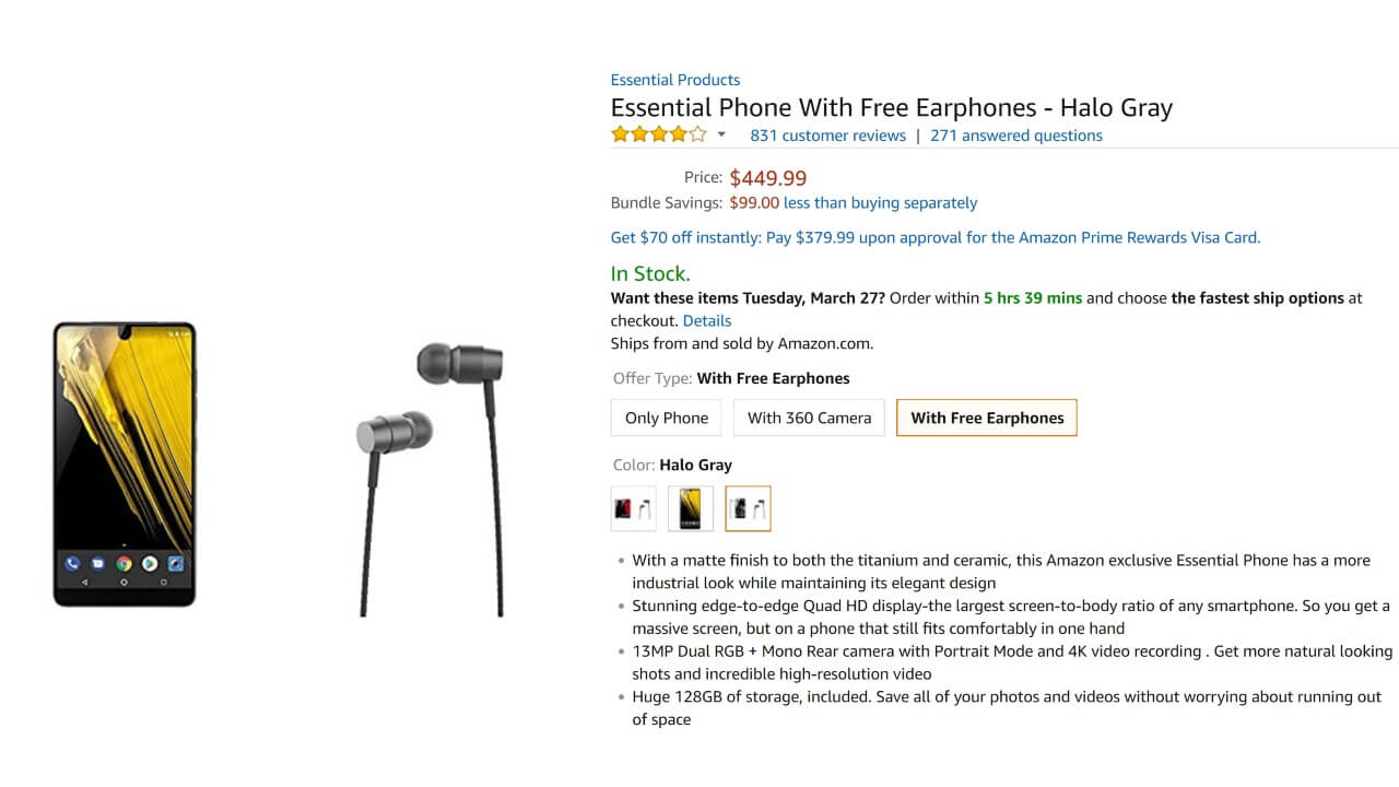 [amazonjs asin=”B07BF7JWF4″ locale=”US” title=”Essential Phone With Free Earphones – Halo Gray”]