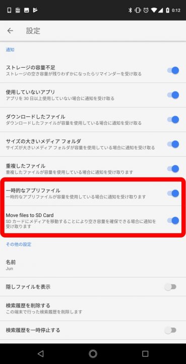“一時的なアプリファイル” は、一時的なアプリファイルがストレージを使用しているときに知らせてくれる通知機能です。“Move files to SD Card” は、SD カードにファイルを移動することで容量を確保できる場合に知らせてくれる通知機能です。