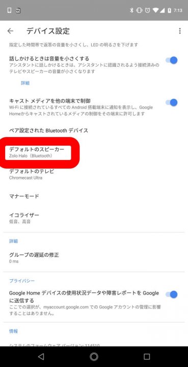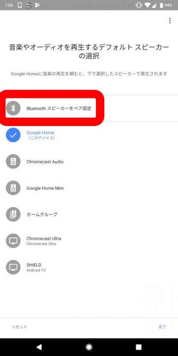 Bluetooth スピーカーをペアリングする手順は簡単で、「Google Home」アプリから使用している「Google Home」スマートスピーカーの設定をタッチし、“デフォルトのスピーカー” → “Bluetooth スピーカーをペア設定” をタッチして、Bluetooth ペアリングモードにしている Bluetooth スピーカーと接続します。