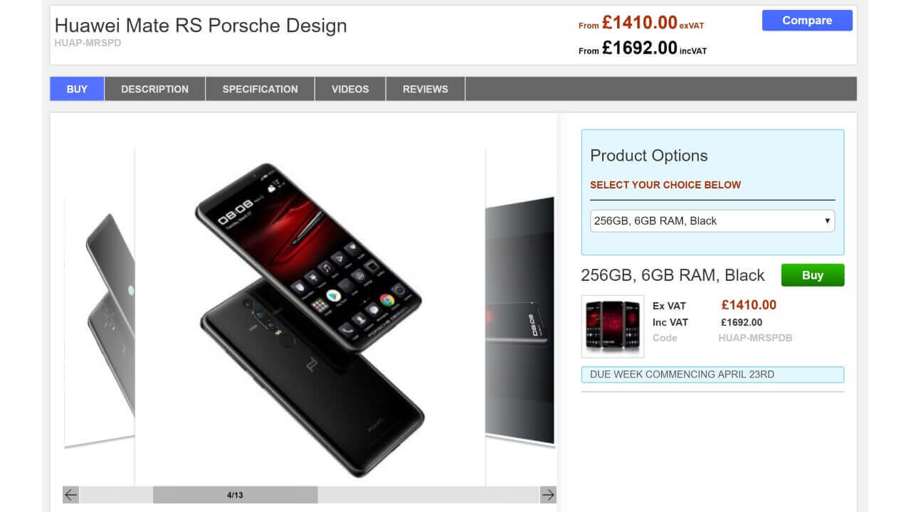Clove における「Huawei Mate RS Porsche Design」の価格は VAT 抜き £1,410.00(約 214,550 円)で、4 月 23 日入荷予定です。ちなみに内部ストレージは、256GB 搭載となります。