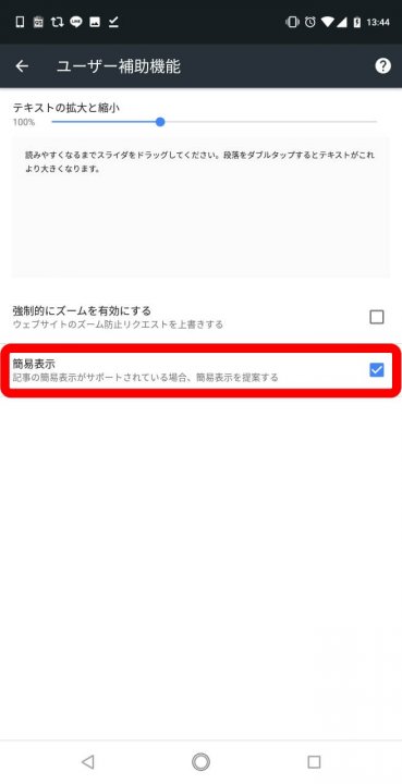 また簡易表示はもともとデータセーバーを ON にしている場合は自動で切り替わるようになっているので、データセーバーを常時使用しているユーザーにとっては恐らく意味のない設定です。簡易表示の ON / OFF 設定は「Chrome」のメニューアイコンから “設定” をタッチして “ユーザー補助機能” へと進み、“簡易表示” のチェックボックスにチェックを入れます。