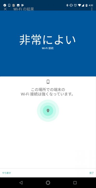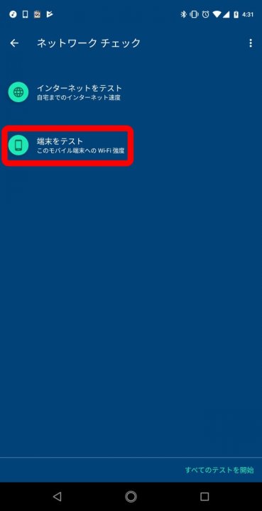 「端末をテスト」は、「Google Wifi」に接続している Android か iPhone の Wi-Fi 強度をテストできる機能です。機種ごとの Wi-Fi 強度はもちろん、テストする場所における Wi-Fi 強度をチェックすることができます。